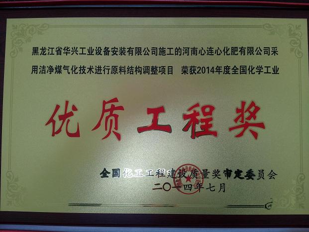 江南官方网页版施工的“河南心连心化肥有限公司采用洁净煤气化技术进行原料结构调整项目”荣获全国化工工程建设质量奖评审委员会颁发的2014年度全国化学工业优质工程奖。